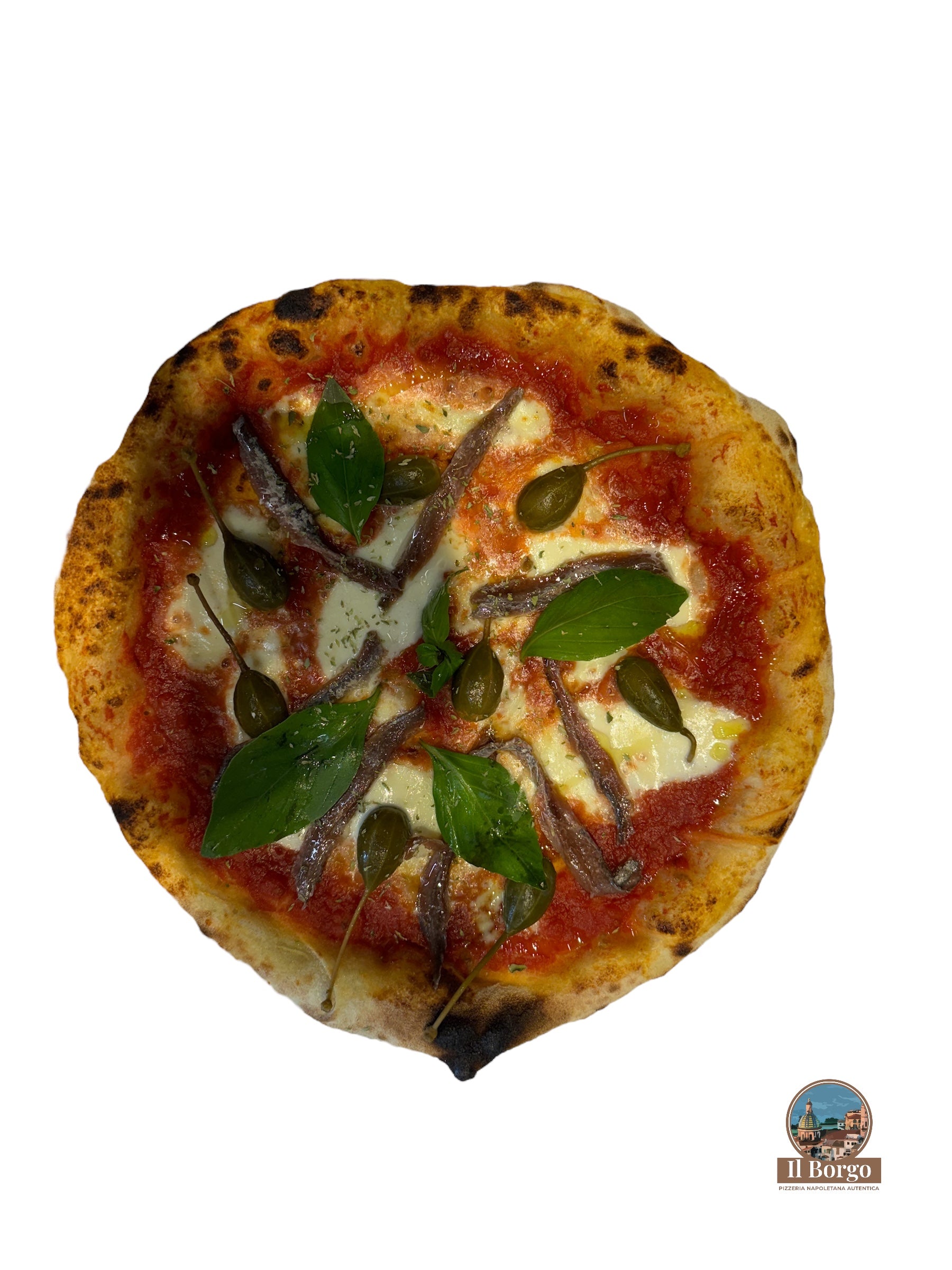 Tomatensauce, Fior di Latte, Sardellen, Kapern, Oregano, Basilikum, Olivenöl Bio